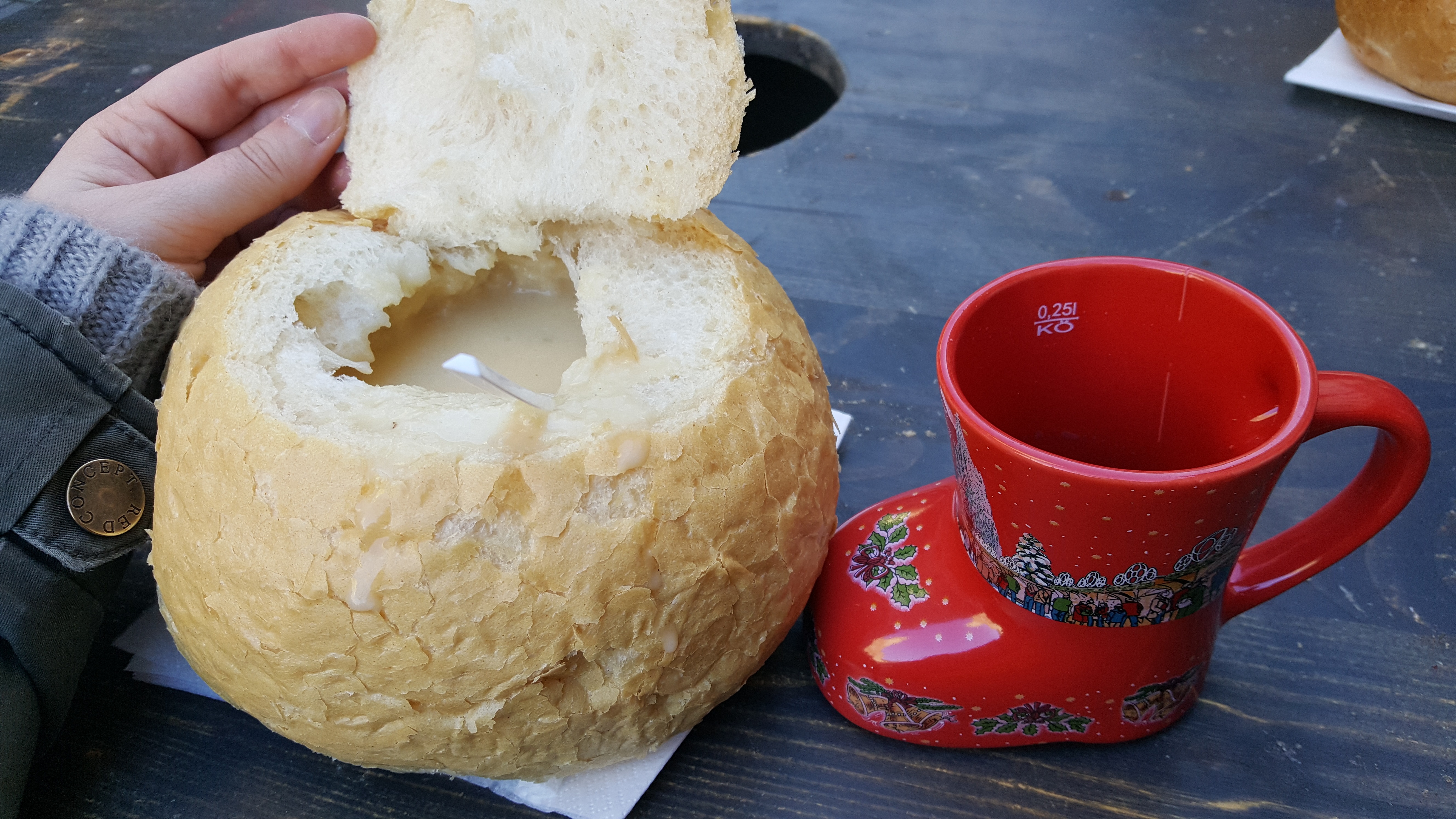 Chacun propose ses vins chauds et autres punchs chauds dans des mugs spéciaux dont on paie la caution… le plus dur étant alors de les rendre car ils sont beaux et font de parfaits souvenirs en période de Noël !