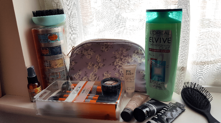 Le second lot (photo juste au-dessus) contient principalement un set de boite de thés Les Russes de Kusmi ainsi qu’un set de pinceaux Core Collection de Real Techniques. Dans une trousse violette Laura Ashley, j’ai ajouté un trio full-size blush-bronzer-highlighter crémeux de ModelCo, un shampooing full-size à l’argile Elsève de L’Oréal, un mini primer pour cheveux Philip Kingsley, un mini spray coiffant Amika, deux miniatures de shampooing Algotherm et Parlor. Il y a aussi un échantillon d’après-shampooing Parlor, une brosse Tangle-Teezer-like et une brosse Wet Brush midi.