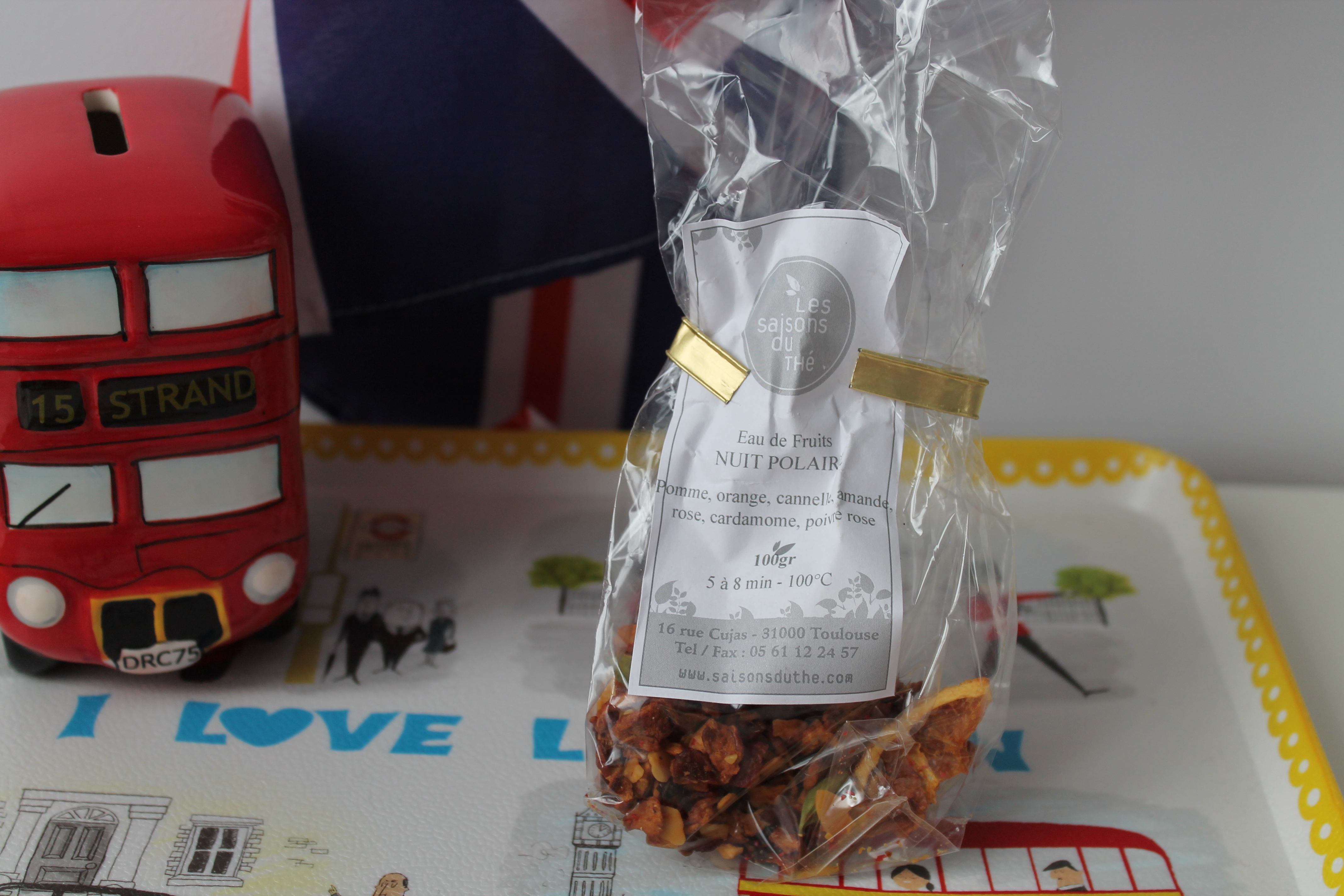 J’ai découvert les eaux de fruit il y a quelques années avec celles de Lov Organic. J’aime bien ce type d’infusion qui change des décoctions de plantes aromatiques. Aussi, il y a quelques mois, j’ai craqué olfactivement pour l’eau de fruits Nuit Polaire des Saisons du thé, vendue dans la boutique toulousaine du même nom (qui fait aussi salon de thé) (6 euros et quelques les 100g). Je me disais que ce serait parfait pour l’hiver…