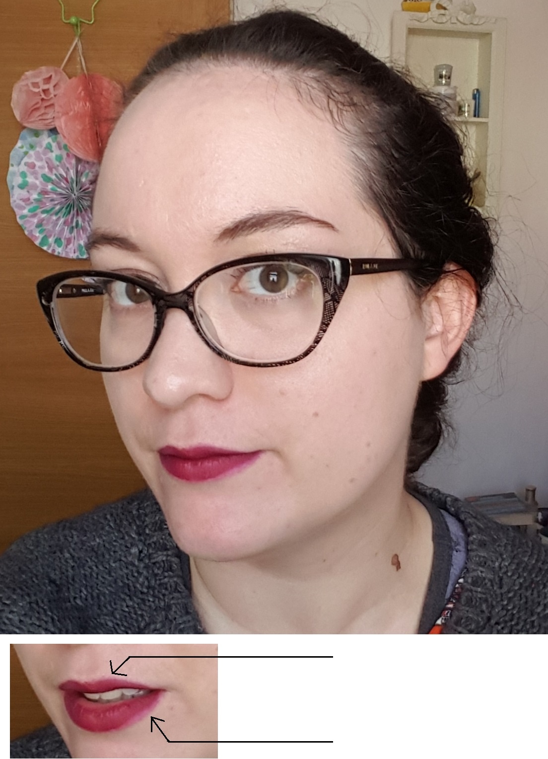 La seule facon pour moi de sortir de chez moi à l’heure sans faire peur, de bon matin, c’est d’utiliser un gloss ou un baume teinté par-dessus ce rouge Kat Von D. C’est d’ailleurs ce que j’ai fait avec un baume 2B Cosmetics sur la photo du haut… C’est joli comme ça aussi, hein, mais ce rouge Kat von D est superbe quand il est mat… mais seulement quand il est bien appliqué !