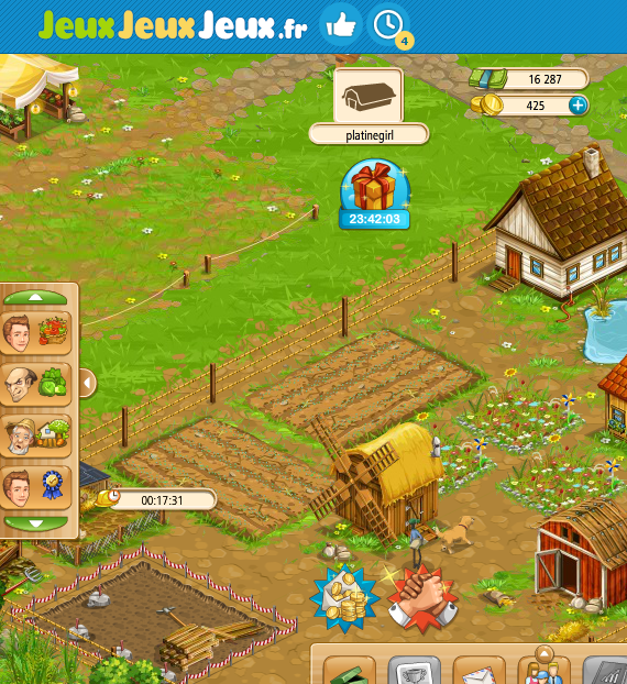 Je préfère les plateformes françaises (comme cela, je ne partage pas un compte avec un collègue ! ), et JeuxJeuxJeux.fr en particulier, j’en avais entendu parler sur la toile. J’ai tendance à préférer la catégorie cuisine par simple gourmandise et, après avoir testé des jeux plutôt basiques et enfantins (mais pratiques, ils permettent d’apprendre les ingrédients d’une glace ou d’un risotto ! ), j’ai jeté mon dévolu sur Big Farm, un MMOG (jeu en ligne massivement multijoueur) qui me permet de devenir une agricultrice ! Alors, je chausse mes bottes, je mets mon tablier et je file semer des fleurs sauvages, construire un moulin, récupérer les oeufs de mes poules…
