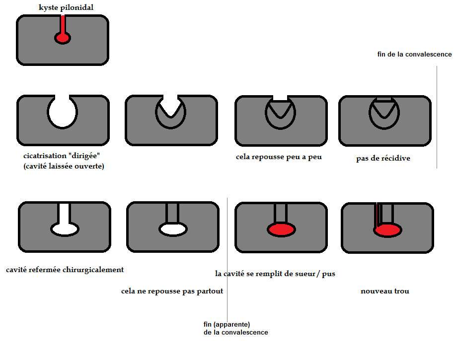 Je suis retournée la voir en mai, et j’en ai profité pour rencontrer un de ses confrères (chirurgien digestif) pour être sûre du diagnostic. Leur verdict a été sans appel : j’ai besoin d’une nouvelle chirurgie. En gros, ce serait pas une vraie récidive, mais plutôt une anomalie de cicatrisation dûe au fait que, lors de ma première opération, mon kyste a été suturé (cf schémas fait-maison ci-dessous – coupe transversale au niveau des fesses). Aussi, cette fois-ci, pour que ce soit bel et bien fini, il va non seulement falloir ouvrir et retirer de la chair… mais aussi laisser repousser “à ciel ouvert” (avec des mèches internes à changer régulièrement – sans fermer, donc) pour s’assurer que la cicatrisation se fasse bien.