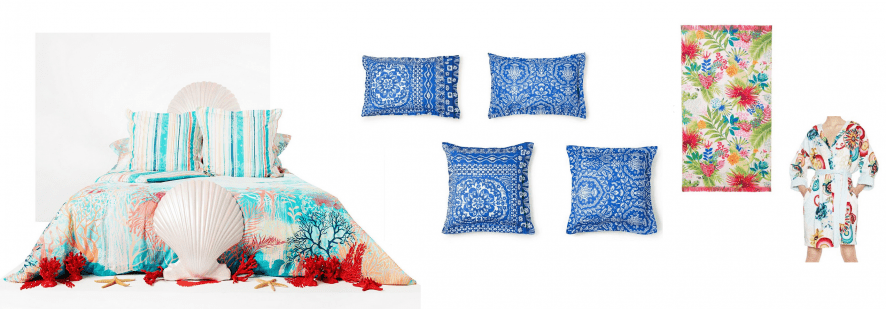 Ceci étant dit, j’aime énormément la collection maison de la marque. Et, elle, je veux bien la payer plein pot, car j’ai l’impression qu’elle ne me lassera pas. Je possède quelques linges de cuisine Desigual, et je suis tombée amoureuse récemment de cette serviette de bain, de cette parure de lit… et que dire de la collection Think In Blue ? Elle me fait rêver !