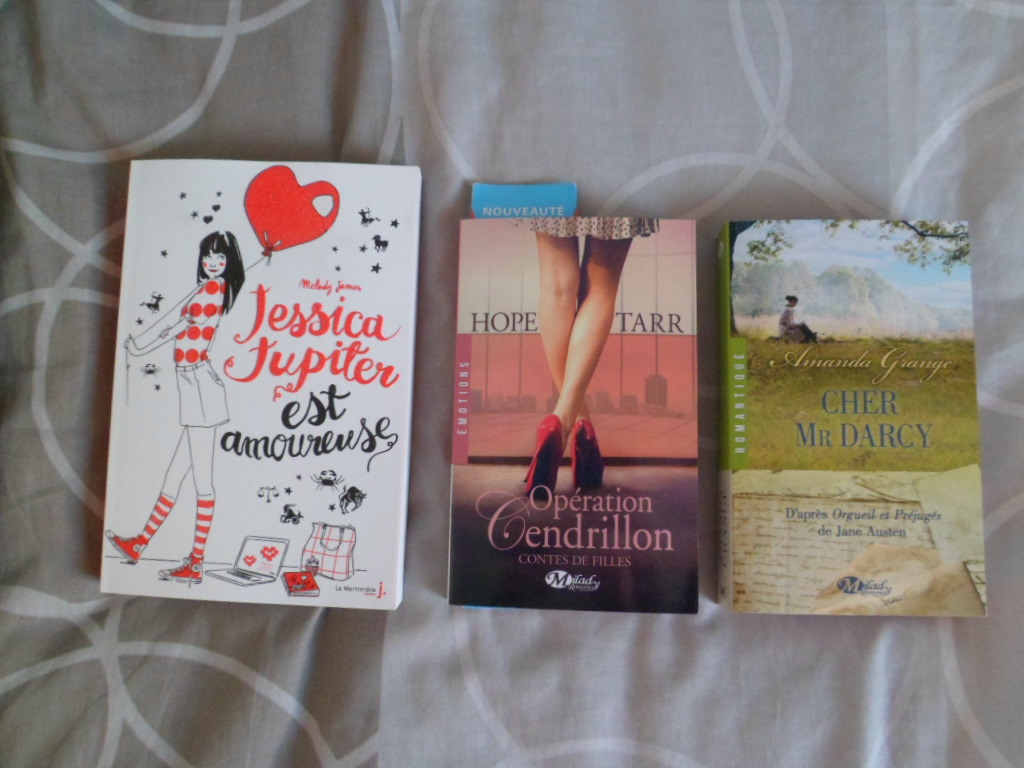 Coté lecture, j’ai reçu trois livres papiers : Jessica Jupiter 4, Opération Cendrillon et Cher Mr Darcy. Ainsi que quelques romances numériques : L’esprit Darcy, Wherlocke 3, Coeurs vaillants 2 et Fiancailles à Brentmore Hall.