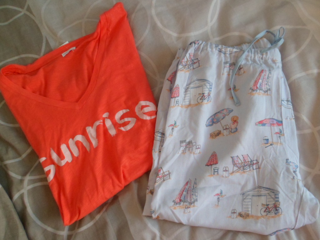 Coté mode, je me suis arrêtée devant les promos de fin de saison chez Oysho où ce t-shirt coloré et ce bas de pyjama m’attendaient sagement pour moins de 28 euros l’ensemble.