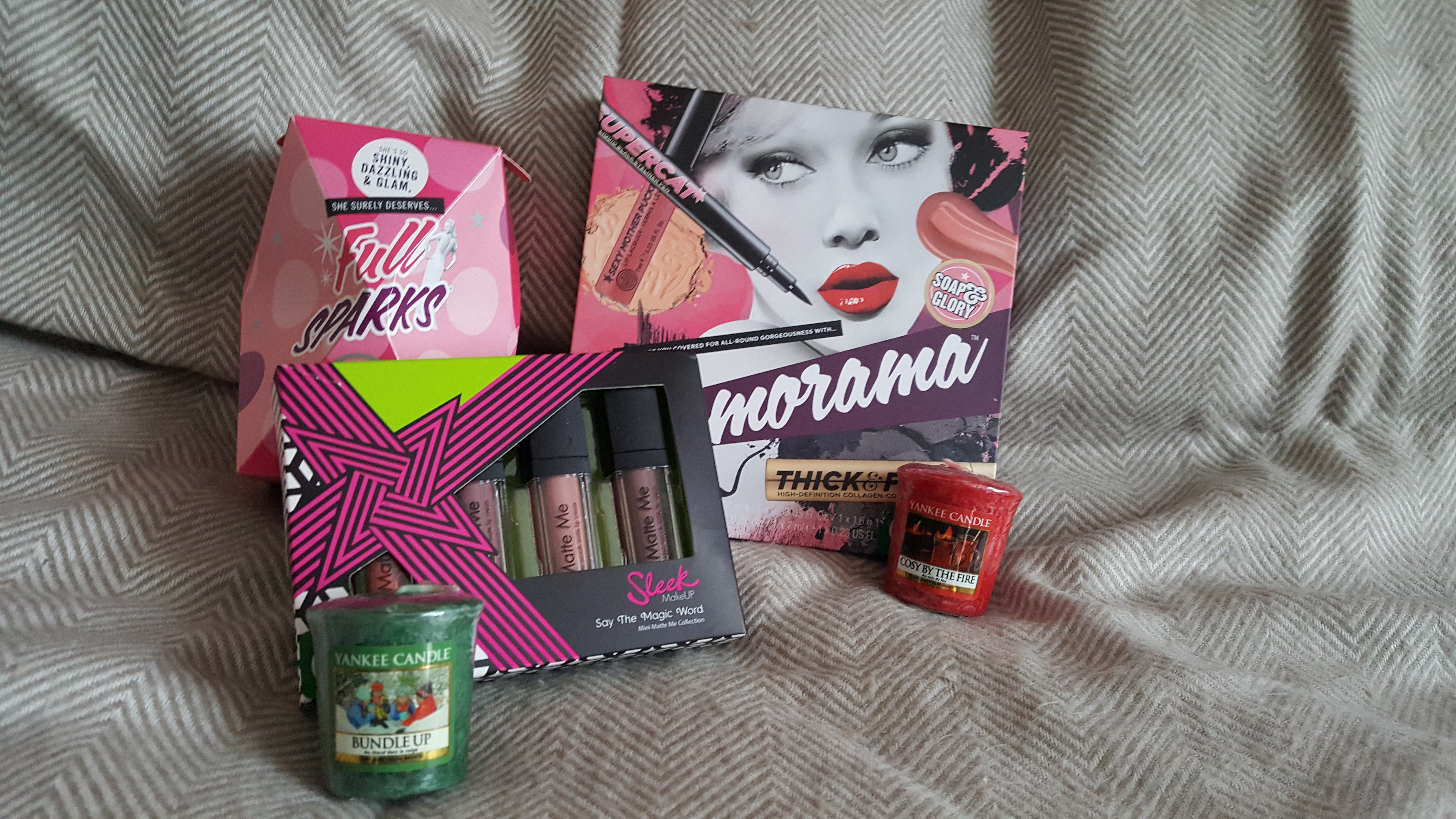 Chez Boots, j’avais un bon d’achat d’une trentaine d’euros à dépenser, j’y ai pris trois coffrets (c’était trois pour le prix de deux, j’ai choisi deux Soap and Glory et un Sleek) ainsi que deux petites votives Yankee Candle de saison. #teambonplan