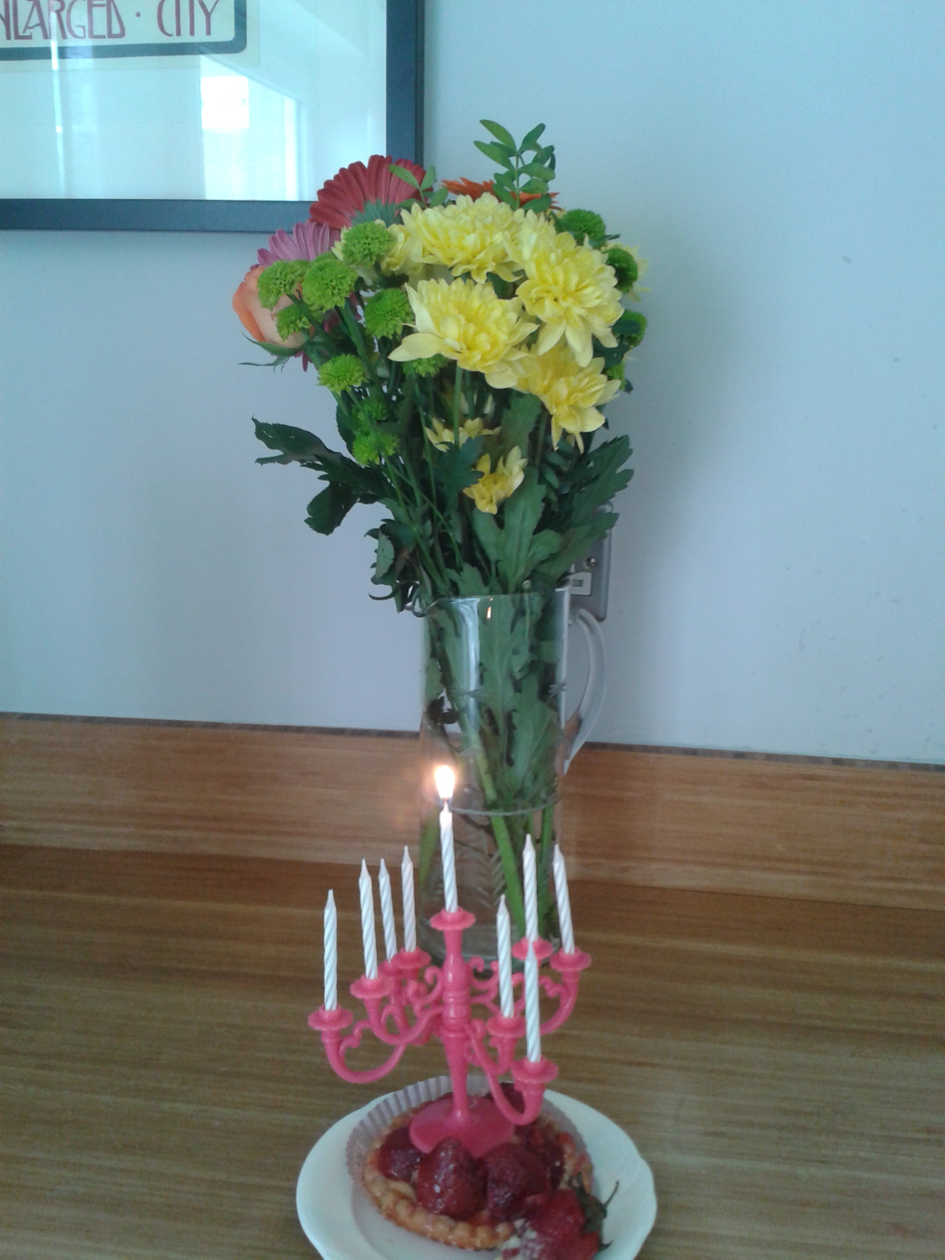 Et, enfin, je me suis offert ce bouquet de fleurs et ce chandelier rose pour bougies d’anniversaire (chez Tiger).