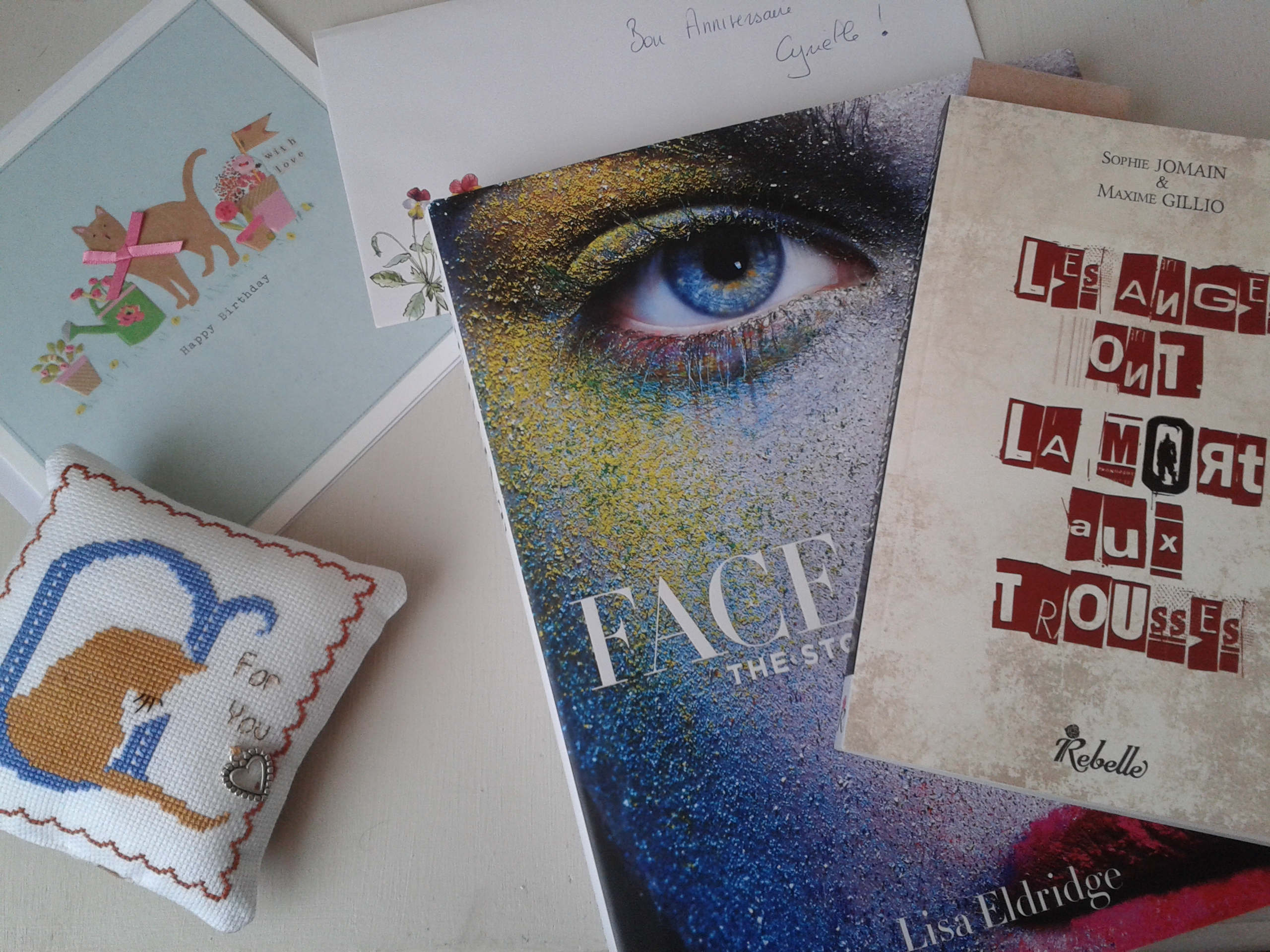 J’ai reçu deux jolies cartes, un mini coussin-chat et je me suis offert deux livres : le cross-over de Felicity Atcock de Sophie Jomain, et le best-seller sur le maquillage Face Paint de Lisa Eldridge.