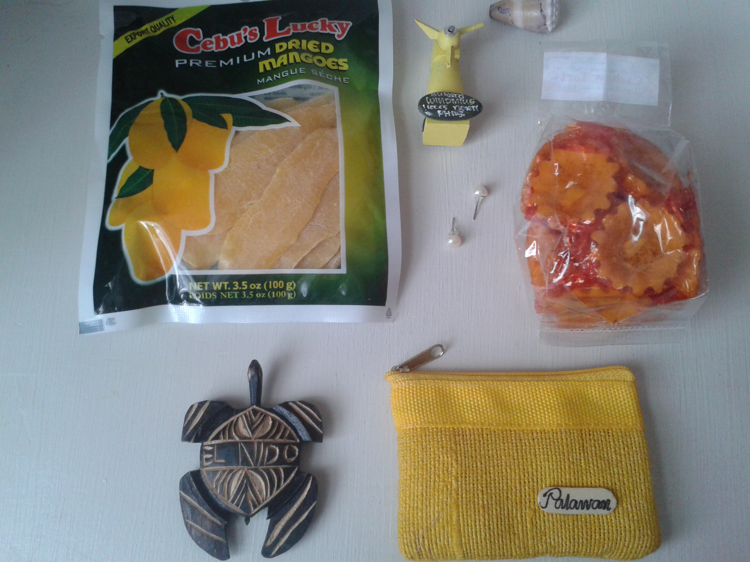 Une copine m’a ramené plein de souvenirs de son voyage aux Philippines : des mangues séchées (que c’est bon ! ), des perles en boucles d’oreilles, un porte-monnaie, des tartelettes aux noix de cajou…