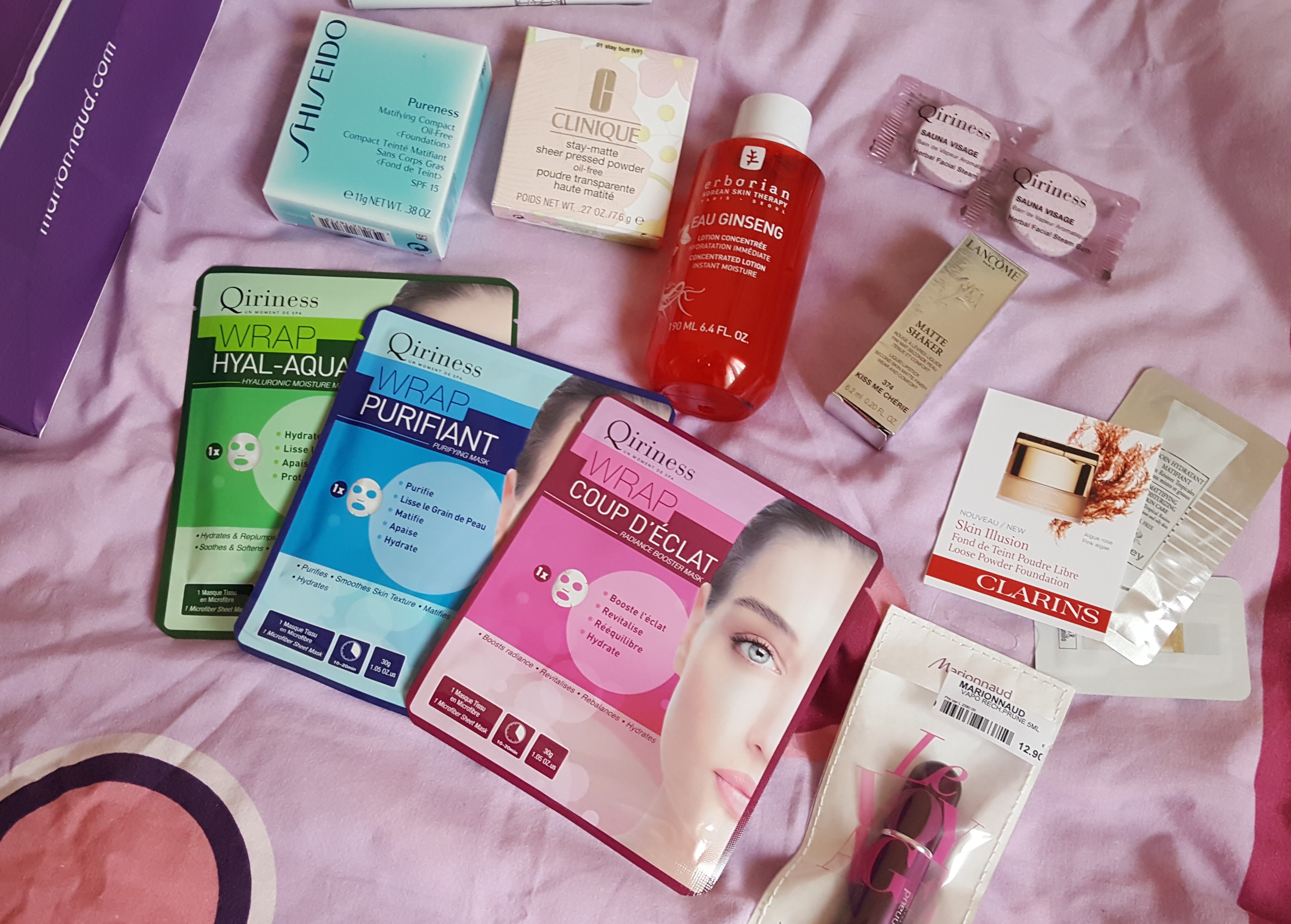 Au programme, le mascara transparent / soin des cils Diorshow Maximizer 3D de Dior – conseillé par Kléo Beauté récemment (ne le cherchez pas sur la photo, il a glissé vers le haut), le fond de teint compact Pureness de Shiseido (depuis le temps qu’il me faisait de l’oeil ! ), la poudre compacte Stay-Matte de Clinique (je n’avais plus de compact dans mon sac depuis quelques mois…), la lotion Eau Ginseng de Erborian, un rouge Matte Shaker de Lancôme, trois masques monodose de Qiriness (je n’avais jamais testé la marque), un vaporisateur de sac Travalo par Marionnaud et plein d’échantillons, dont des galets effervescents Qiriness. Le tout pour seulement 20 euros de ma poche, et encore, je n’ai pas déduis mon salaire du total ! 😀