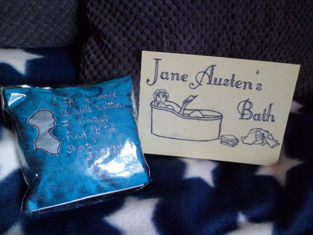 Impossible d’aller à Bath sans passer par le Jane Austen Centre et sa boutique de produits dérivés. Je me suis offert un petit sachet de lavande pour mon armoire et cette carte postale humoristique…