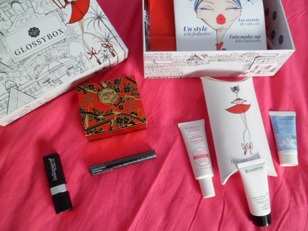 Contenu et valeur totale : un savon Carmin de la Société parisienne de savons (50g – 5 euros), un rouge à lèvres Bellapierre (full size de 3,5g – 19,99 euros), une base pour les cils Manna Kadar (4g – 12,18 euros) et trois miniatures de soins pour peaux mixtes / grasses : un sérum magnifiant NoxiDoxi (25mL – 33,25 euros), une crème exfoliante bio Coslys (20mL – 3,47 euros) et un fluide hydro-matifiant Académie Scientifique de Beauté (15mL – 11,07 euros). Au final, je suis satisfaite, je vais pouvoir découvrir de nombreux produits qui me seront vraiment utiles, pour un prix défiant toute concurrence : 15,50 euros au lieu de 84,96 !