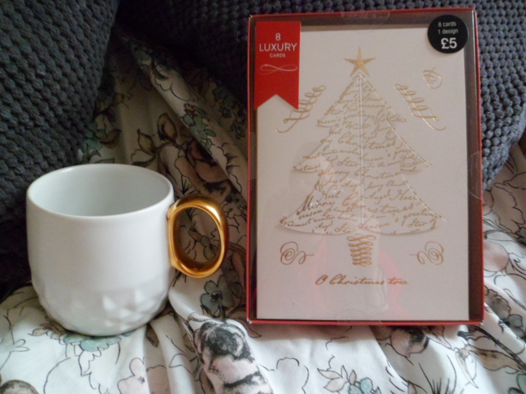A Starbucks, j’ai eu du mal à choisir un mug saisonnier. Je me suis finalement décidé pour cette tasse blanche et dorée au bas super travaillé. Je vous la montre ici avec un lot de cartes de voeux de chez Marks & Spencer, vu que les Anglais sont friands de cartes de Noel dès Thanksgiving (c’est jeudi).