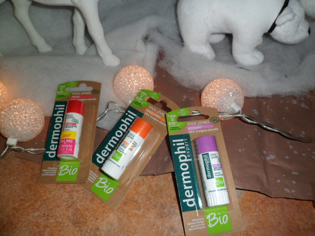 Mes lèvres seront aux anges avec les nouveaux baumes Dermophil… bio ! En plus, ils sont aromatisés : Mandarine et Fraise, j’ai aussi reçu le violet qui est apaisant.