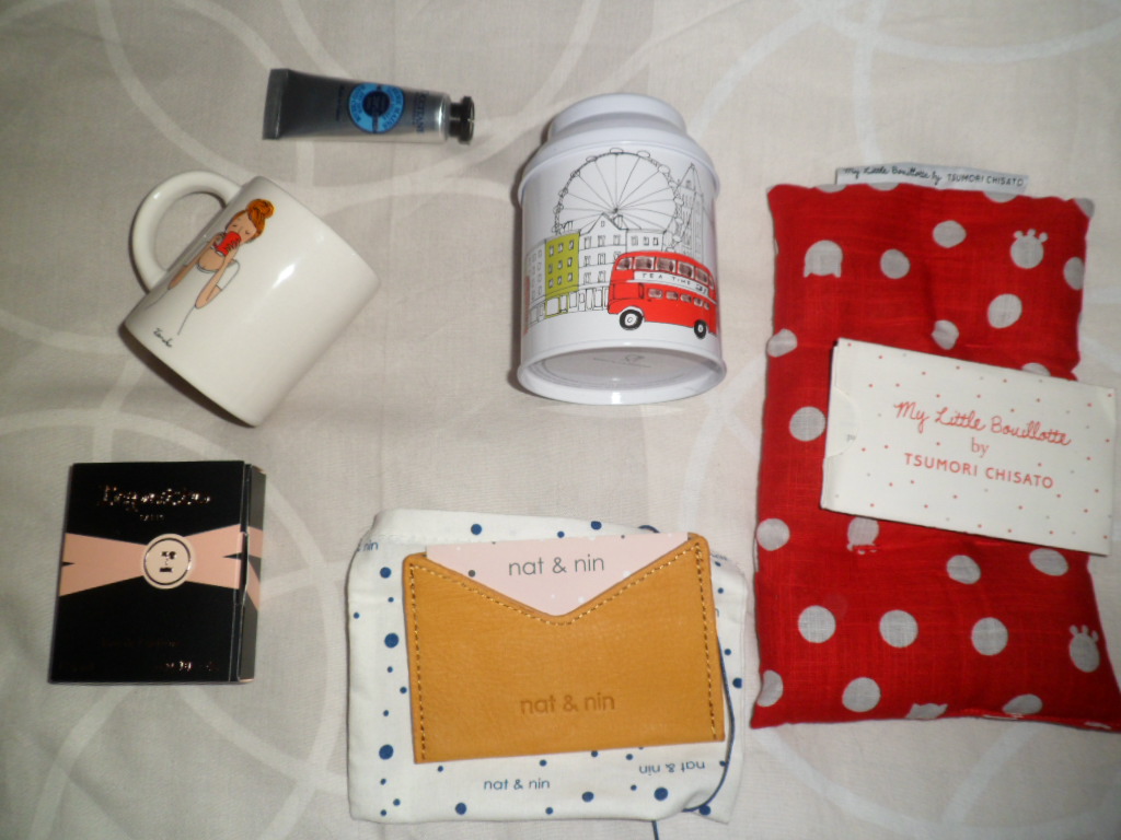A mon retour, j’ai trouvé un joli colis de la part de Marie (r1girl) qui me permet de récupérer quelques uns des goodies lifestyle de My Little Box qu’elle a reçu ces derniers mois ! A moi ceux qui me faisaient le plus envie : le porte-carte Nat & Nin, la tasse et la bouillotte de novembre, la boite à thé Londres et la miniature de l’eau de parfum Repetto. Elle m’a aussi glissé une mini crème pour les mains L’Occitane, merci pour tout Marie !