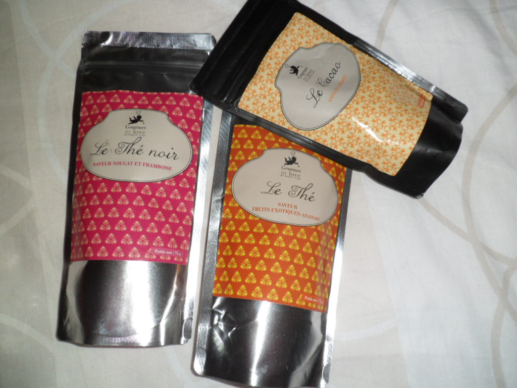 J’ai vite retrouvé en centre-ville de Toulouse Amélie, et elle n’est pas venue les mains vides, pour mon plus grand plaisir ! Ayant passé commande de thés Gourmet in Love, elle a pensé à moi avec le Nougat et Framboise, le Fruits Exotiques et un sachet de chocolat aromatisé au caramel, miam ! Un grand merci à toi !