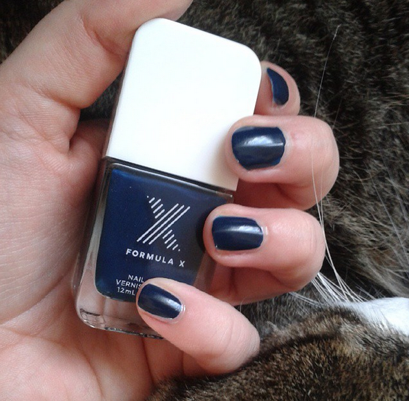 On commence avec mon favori du lot : le vernis bleu sombre Orbit de Formula X. C’était ma toute première expérience avec la marque, j’avoue que je suis subjuguée par ce bleu. J’adore cette couleur, qui est originale tout en restant sobre : ce vernis coloré fait des ongles chics ! En plus, apparemment, le bleu est la couleur de la saison !