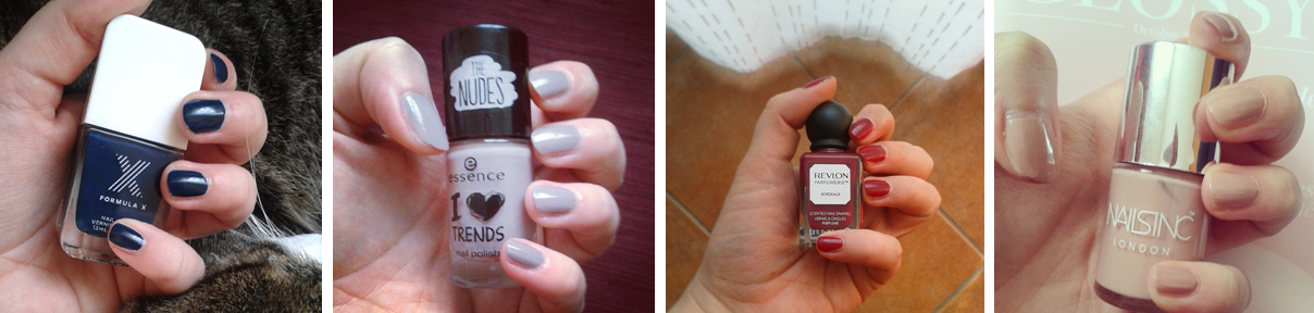 Je vous retrouve avec un billet ongulaire dans lequel je vais disserter des mérites (et des défauts) de quatre vernis aux couleurs automnales. Il va s’agir du bleu foncé Orbit de Formula X, d’un pas-si-nude-que-ça Crunchy Cake de Essence, du bien nommé Bordeaux de Revlon et du vraiment-nude Montpelier Walk de Nails Inc.